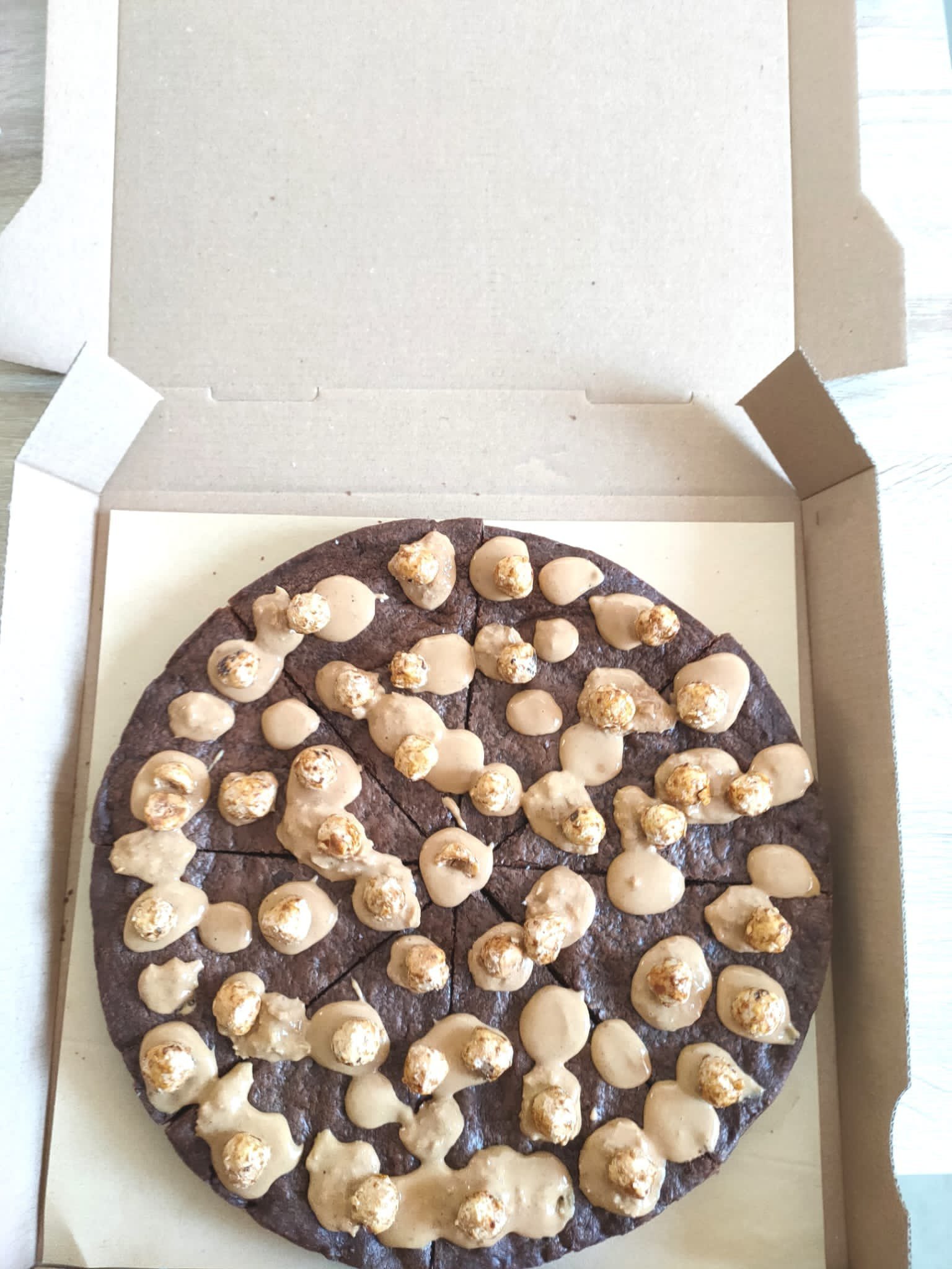 Cookie pizza au chocolat noir, crème 100% noisettes grillées façon Bueno et noisettes caramélisées, irrésistiblement chocolaté.